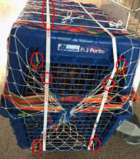 (2)小动物容器外必须使用尼龙防护网。网套网格孔径大小应以动物头部钻不出为准,绳子直径在2mm以上;防护网必须捆扎牢固,扎口位置应避开宠物箱门,并不影响宠物箱平稳摆放。收运时必须确保防护网没有破损。